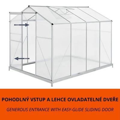 Vedeți descrierea mai detaliatăSeră robustă din aluminiu și policarbonat, 4,75 m², cu fereastră pentru ventilație și bază stabilă.