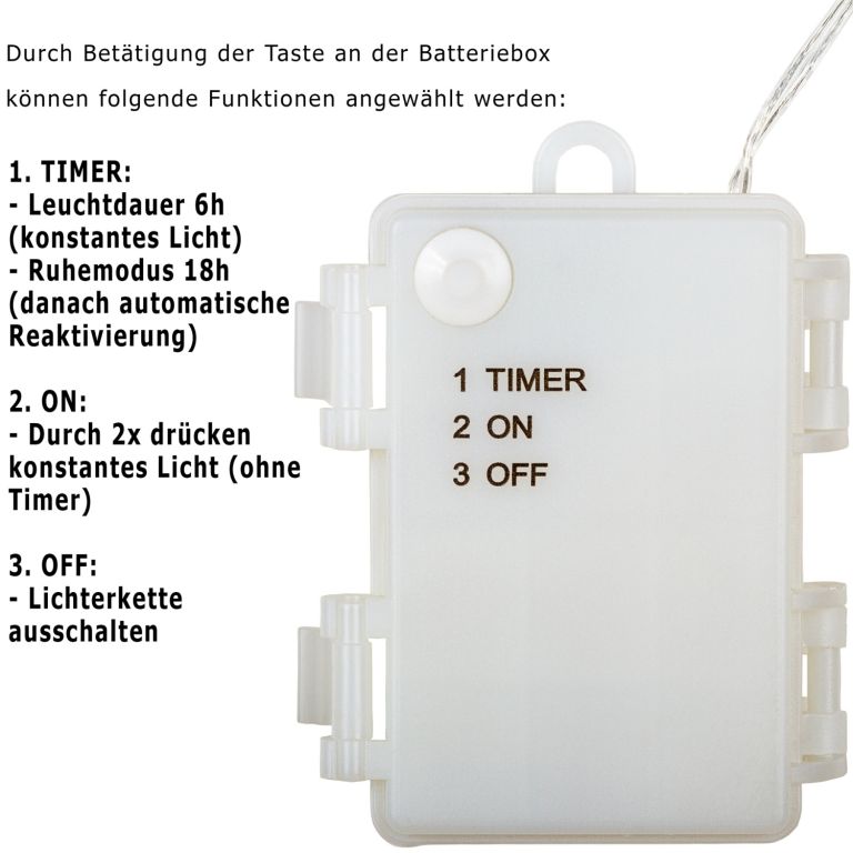 Acest set este ideal pentru a fi folosit în timpul Crăciunului sau ca lumini decorative pentru ferestre, uși, sere sau brad. Datorită firului subțire, lanțurile sunt foarte discrete. De asemenea, conține un cronometru, datorită căruia luminile se vor aprinde timp de 6 ore după prima pornire și 18 ore vor rămâne inactive. Lanțurile de lumină au un slot pentru baterii și sunt proiectate pentru utilizare în interior și exterior.