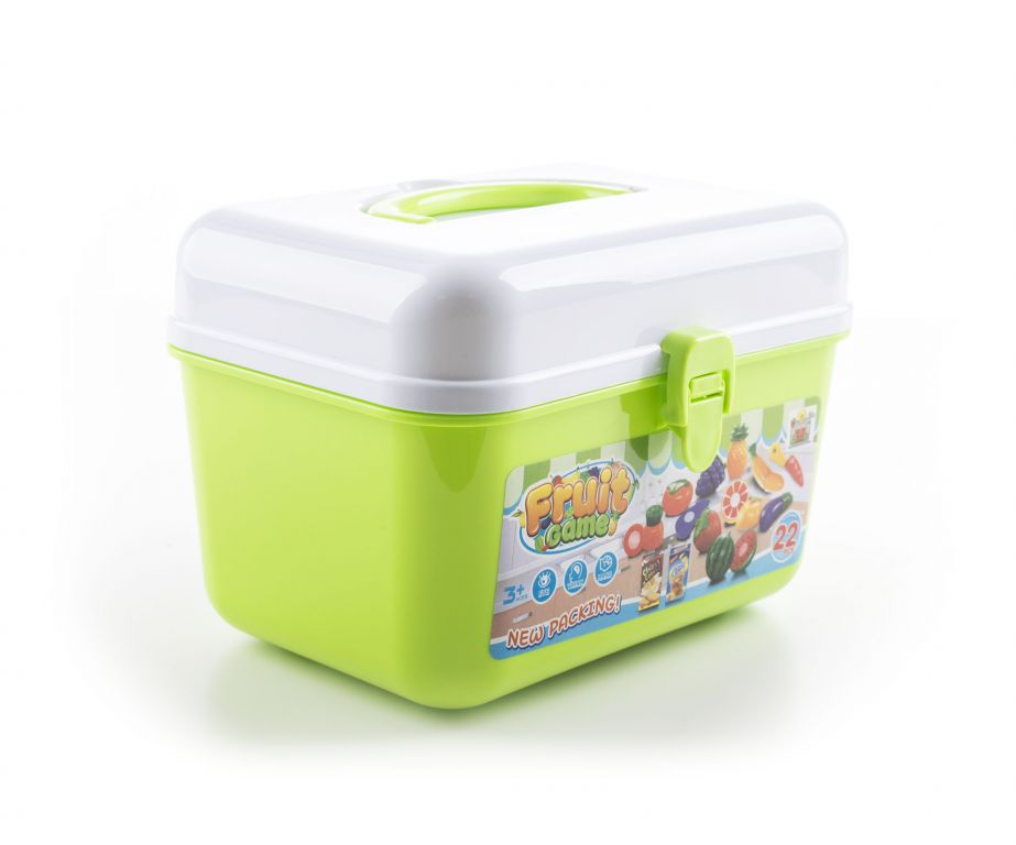 În cutie veți găsi fructe și legume din plastic colorate, alimente în cutii și un cuțit pentru feliat. Fiecare fruct și legumă pot fi împărțite în 2 bucăți. Apoi le puteți reatașa împreună cu scai. Carcasa include și un mâner, datorită căruia cel mic le poate transporta. Toate alimentele și accesoriile sunt fabricate din plastic. Acestea sunt doar replici.
