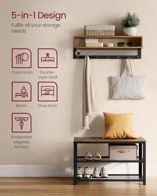 Creați o atmosferă primitoare în hol cu acest set cuier și bancă cu design rustic-industrial. Ideal pentru familii sau spații mici, aduce ordine și stil încăperii dumneavoastră, oferind totodată un loc confortabil pentru încălțare.
