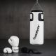 Lanț din oțel sigur și robust, cu suspensie în cinci puncte pentru fixarea sigură, buclele din nailon pentru atașarea lanțului sunt asigurate suplimentar cu nituri. Mănușile de box au fixare degetul mare, sunt căptușite cu spumă și echipate cu găuri pentru aer și velcro.