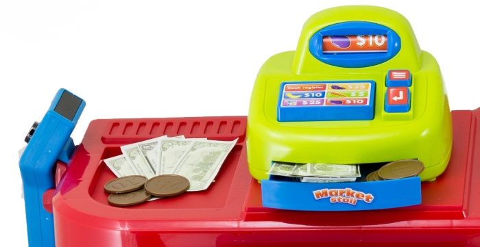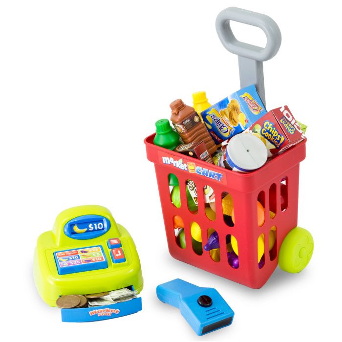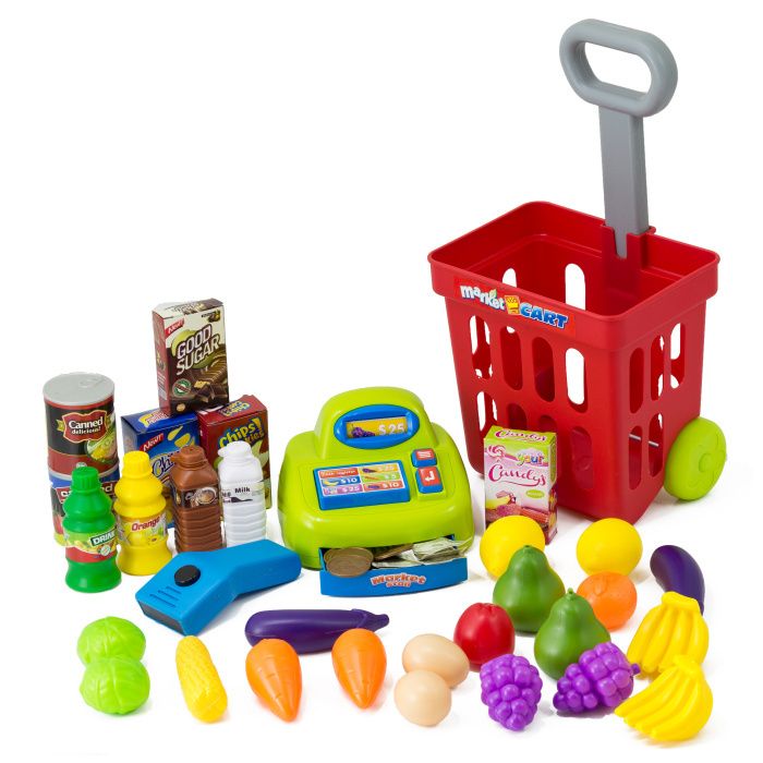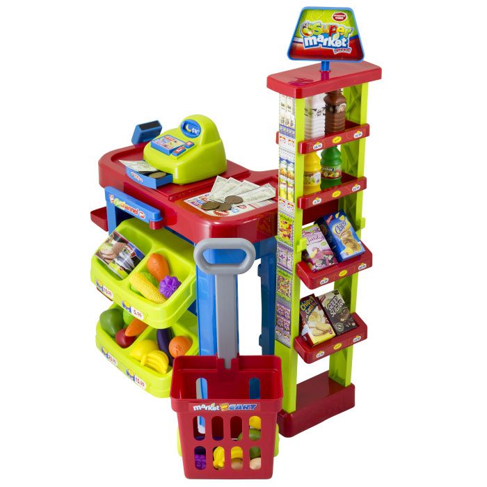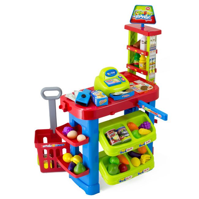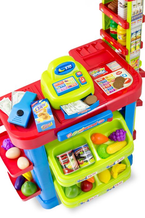 Magazinul pentru copii este o tarabă cu legume, fructe și dulciuri. De asemenea, include o casă de marcat, un cititor de coduri de bare (cu sunet real) și un coș pe roți pentru client. Jocul poate începe imediat. Tot ce trebuie să faceți este să despachetați, să le așezați împreună și să începeți să vindeți.