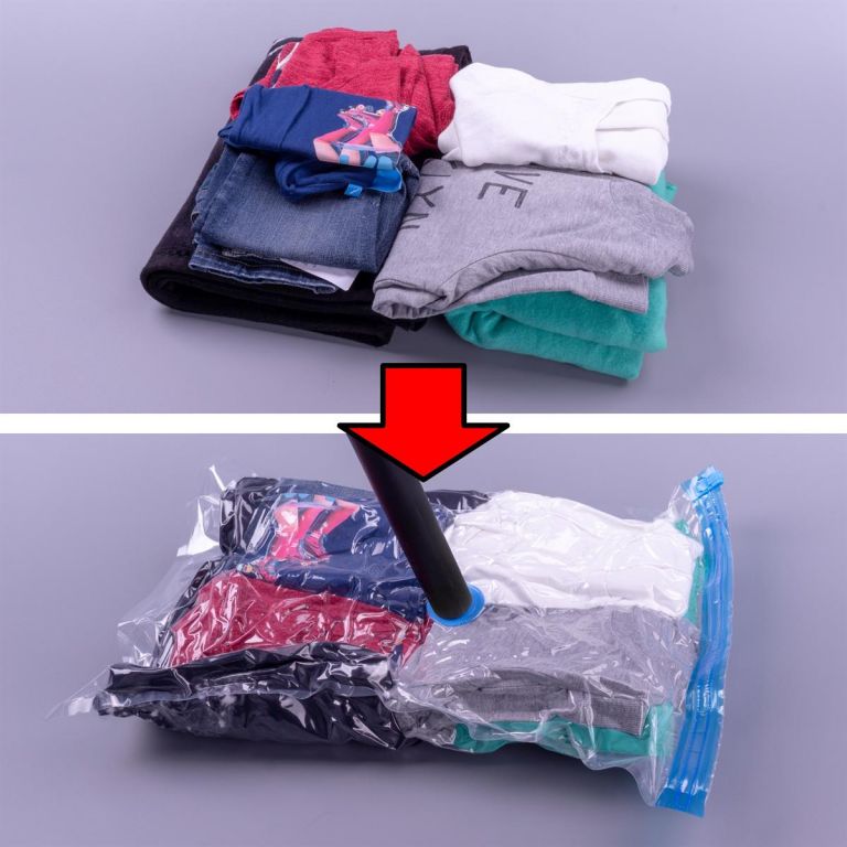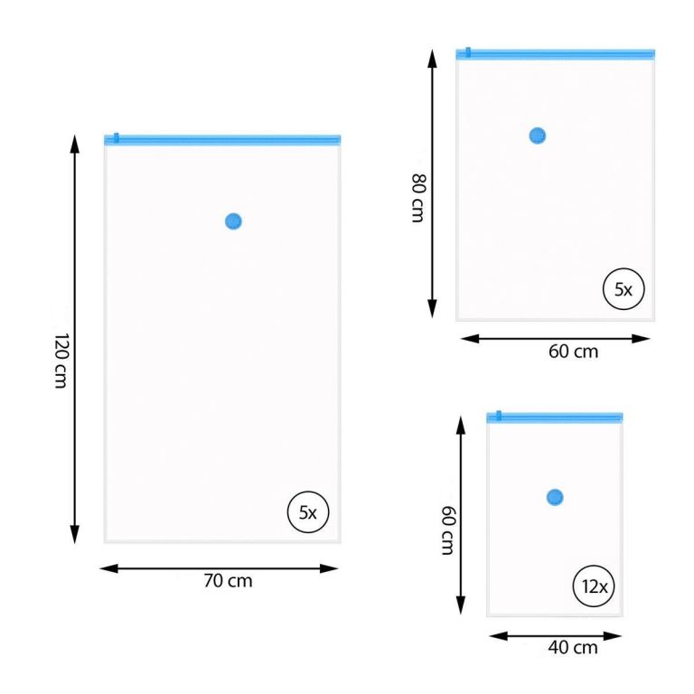Datorită tehnologiei moderne de etanșare, sacii mențin în mod fiabil aerul permanent și în mod repetat. Pungile de depozitare pot fi aspirate cu ușurință cu un aspirator și, datorită unei etanșări duble și a unei supape speciale, mențin un vid permanent. Țesăturile dintr-un sac de vid sunt protejate împotriva efectelor nocive ale mediului, cum ar fi umezeala, mirosurile, dăunătorii sau mucegaiul. Pungile de vid creează spațiu în garderoba sau valiza ta. Pungile pot fi aspirate cu ușurință folosind o pompă manuală, care economisește aproximativ 80% din spațiu. Fie ca acasă, în dulap, pentru depozitarea hainelor de sezon sau pentru călătorii. Pungile noastre de vid sunt ajutoare practice în gospodărie. Pungile sunt fabricate din plastic transparent robust PA + PE.