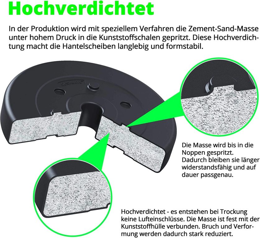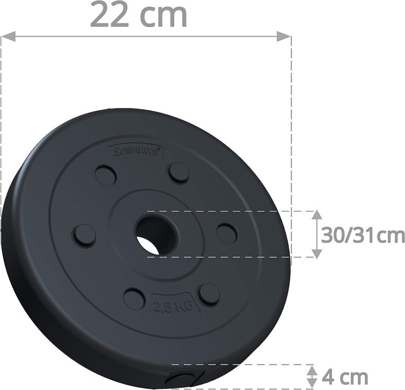 Discurile sunt realizate din plastic rezistent cu umplutură de ciment, având orificiu standard de 30 mm. Designul cu caneluri previne rotirea, iar stratul exterior protejează podeaua. Ușor de întreținut și compatibile cu majoritatea barelor.