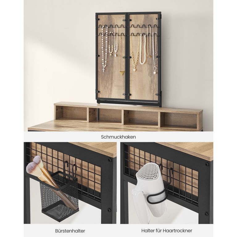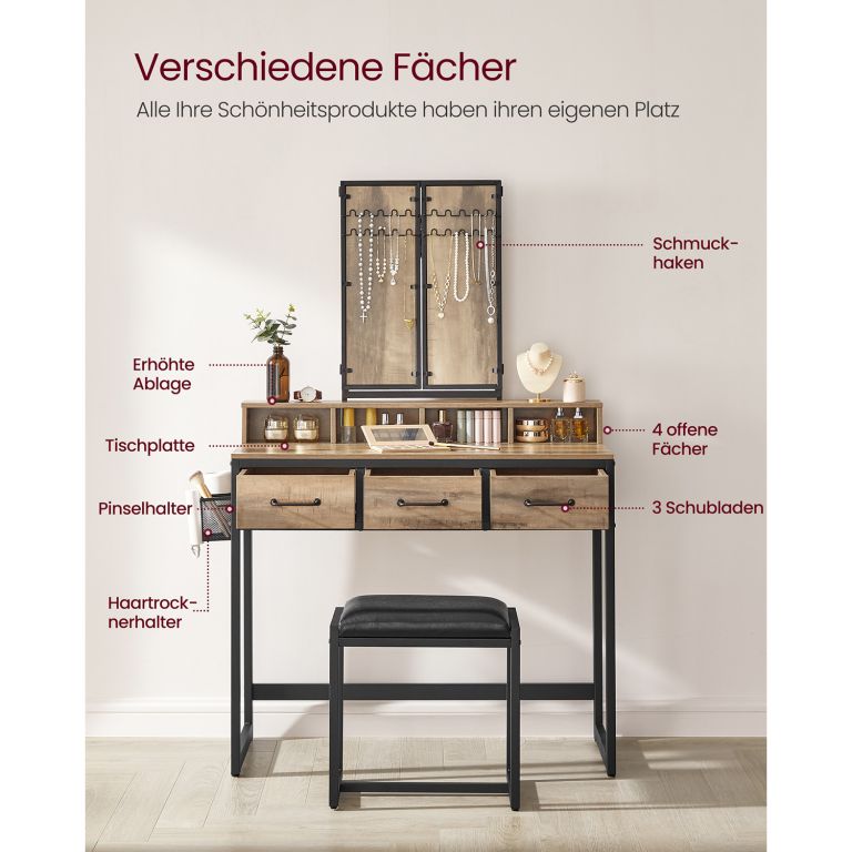 Construcția robustă din PAL și oțel asigură stabilitate și rezistență. Oglinda triplă facilitează machiajul perfect, iar suporturile laterale sunt ideale pentru accesorii. Montaj rapid, întreținere minimă și scaunul rezistă până la 150 kg.