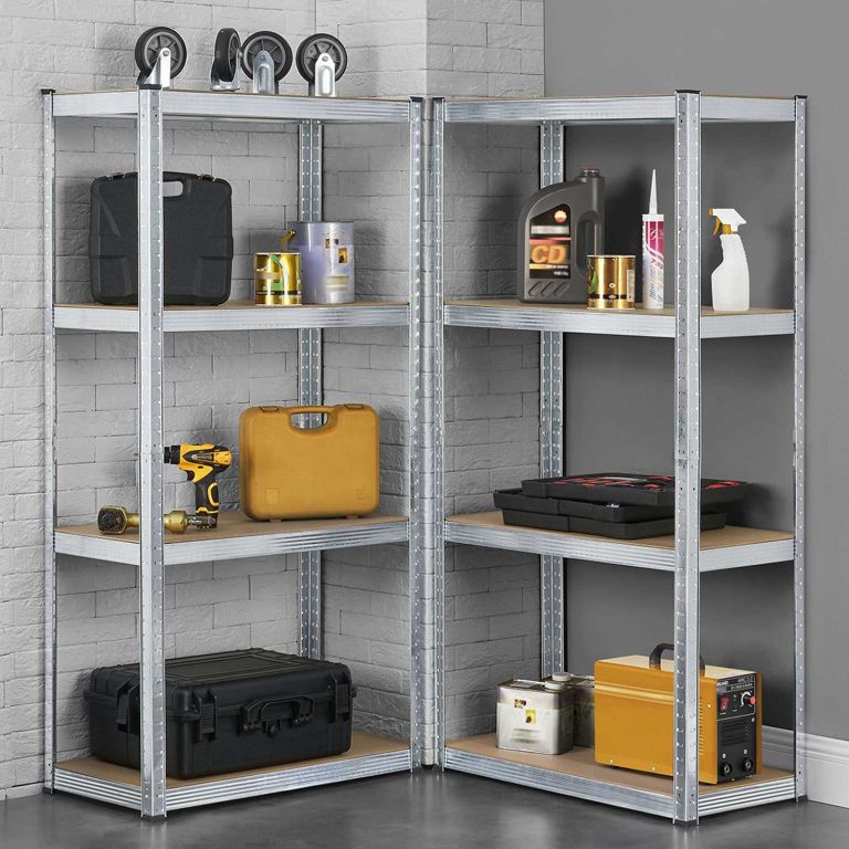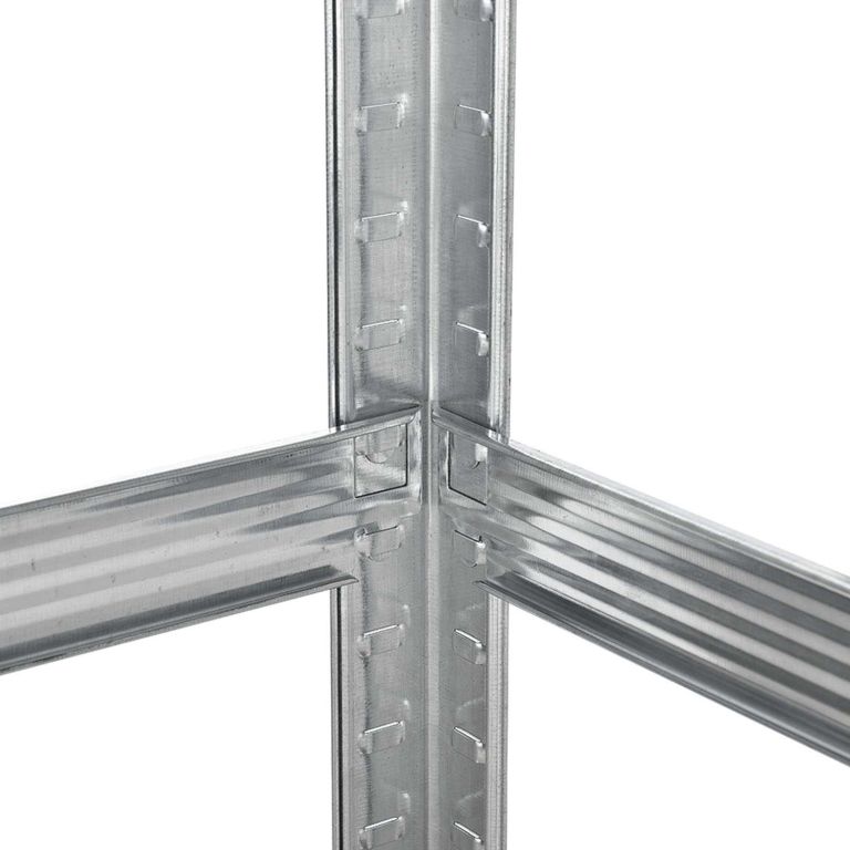 Rafturile sunt fabricate din metal galvanizat rezistent și dispun de patru polițe solide din MDF. Montajul se realizează rapid, fără șuruburi, datorită unui sistem inteligent. Picioarele din plastic protejează podeaua și oferă stabilitate.
