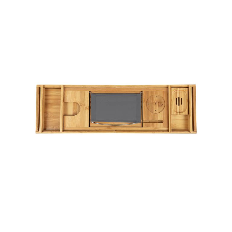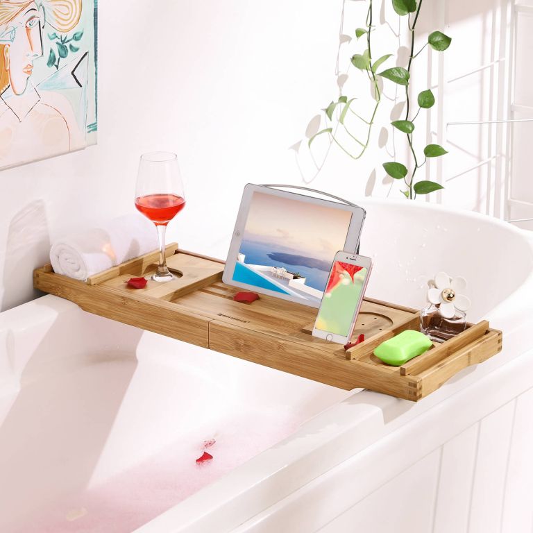 Bucură-te de o baie relaxantă cu suportul extensibil din bambus, ideal pentru carte și vin.