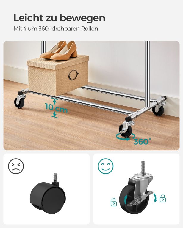 Transformă-ți spațiul cu un suport elegant și practic. Acest suport mobil pentru haine aduce ordine și stil oricărui interior. Bara extensibilă și capetele laterale oferă loc suplimentar pentru accesorii. Perfect pentru garderobă, hol sau magazin.