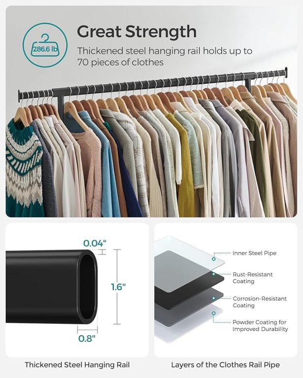 Adăugați funcționalitate și stil casei cu acest suport robust pentru haine, perfect pentru spații mici sau apartamente. Bara extensibilă și capacitatea mare vă ajută să organizați eficient hainele, păstrându-le la îndemână și ordonate.