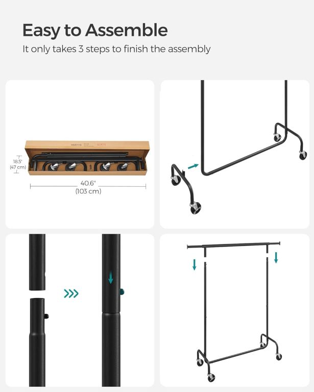 Suport robust pentru haine, extensibil, cu roți și frână, ideal pentru spații mici.
