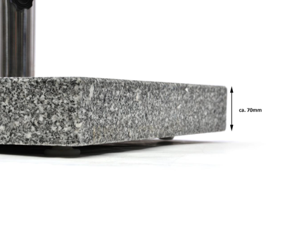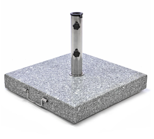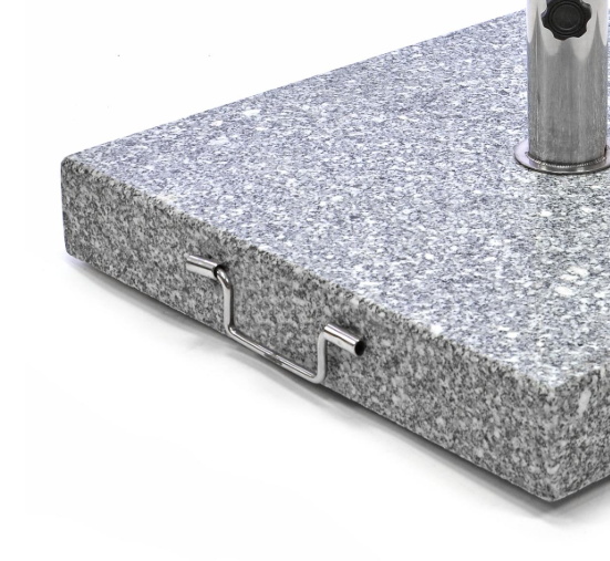 Suportul stabil și elegant este potrivit pentru umbrelele de soare cu diametrul de până la 4 metri, Suportul este confecționat din granit lustruit în combinație cu oțel inoxidabil. Roțile încastrate în partea de jos și mâner din oțel inoxidabil sunt pentru transport ușor. Suportul vine împreună cu 2 manșoane din plastic cu diametrul interior de 39 și 50 mm pentru montarea umbrelei.