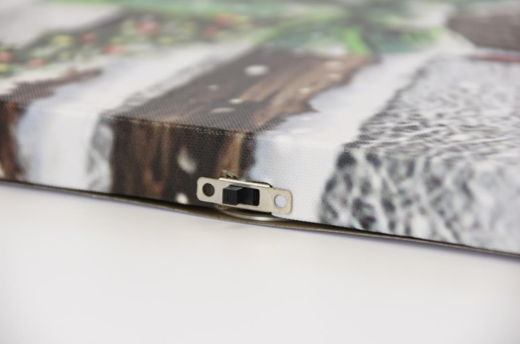Tabloul este realizat pe pânză de calitate montată pe un cadru solid din lemn, cu dimensiuni de 30 x 40 cm. Iluminarea este asigurată de LED și fibre optice cu timer, pentru o utilizare eficientă și sigură. Se montează ușor și funcționează cu 2 baterii AA (nu sunt incluse).