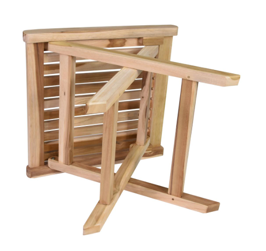 Taburet pliabil din tec natural, ideal pentru baie, hol sau living. Design elegant, ușor de întreținut.