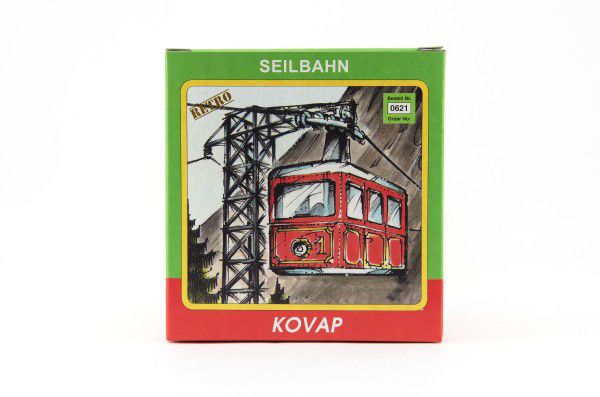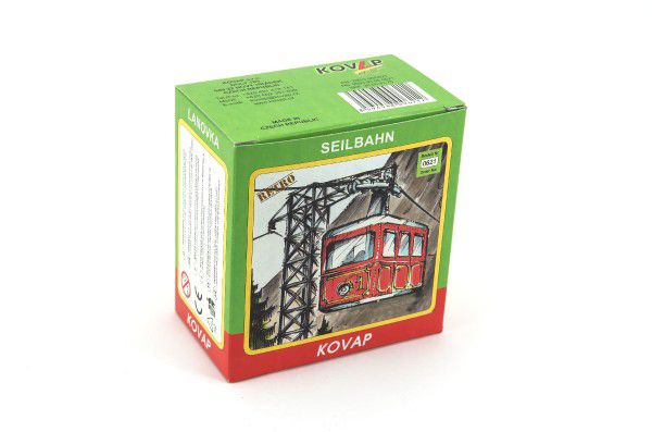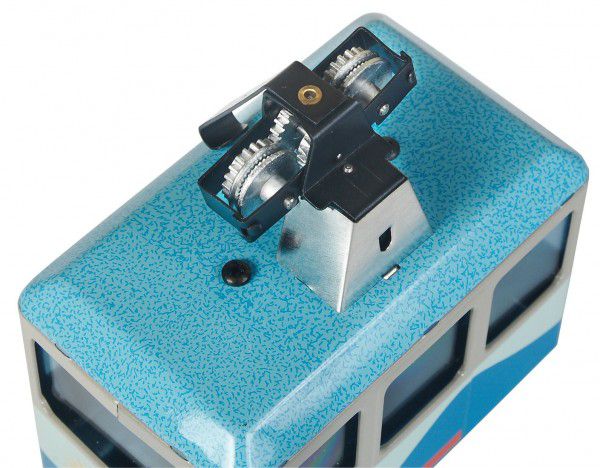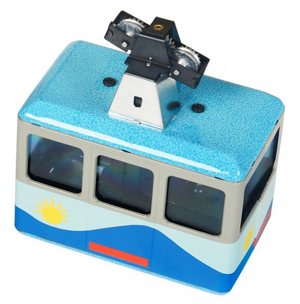 Jucărie originală - model de telecabină cu cheita, care se poate deplasa pe o sfoară. Se deplasează aproximativ 4 metri, cu o înălțime maximă de 0,5 metri. Sfoara este inclusă în pachet. Telecabina este acționată de un mecanism cu arc acționat de o cheie, care este prevăzut cu o frână care pornește sau oprește mișcarea telecabinei pe sfoară.