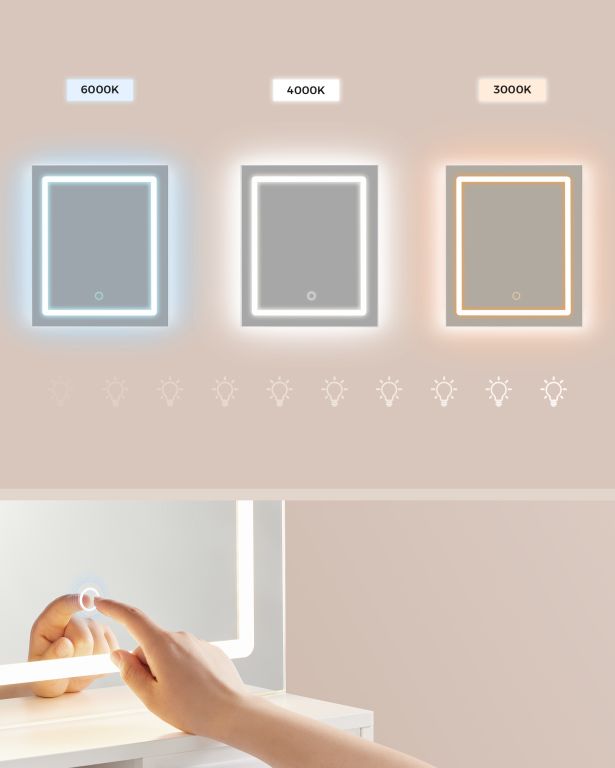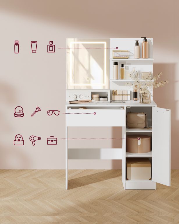Vedeți descrierea mai detaliatăToaletă albă cu oglindă LED, spații multiple de depozitare și panou de încărcare.