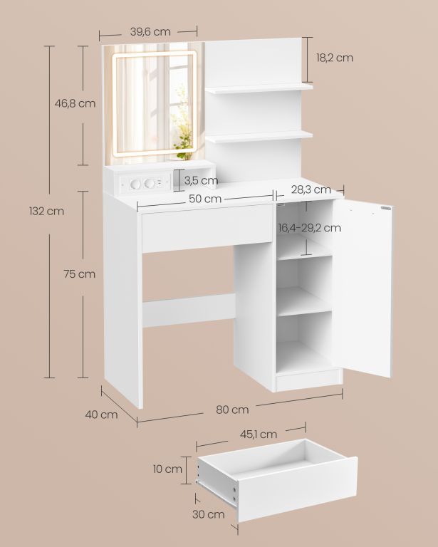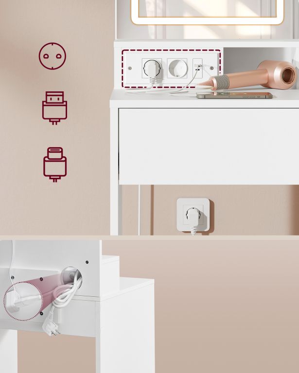 Toaletă albă cu oglindă LED, sertar și dulap, încărcare USB