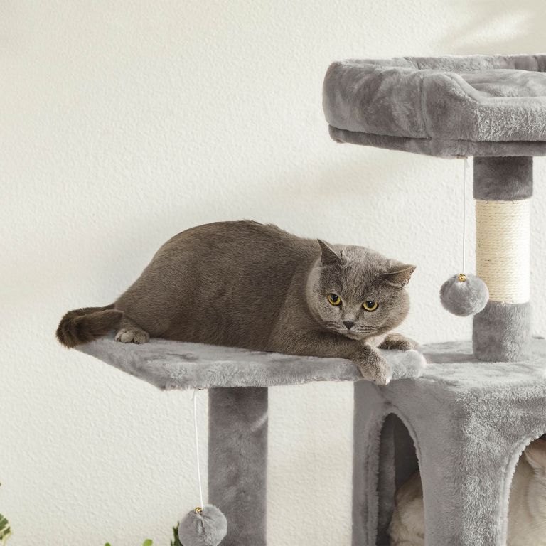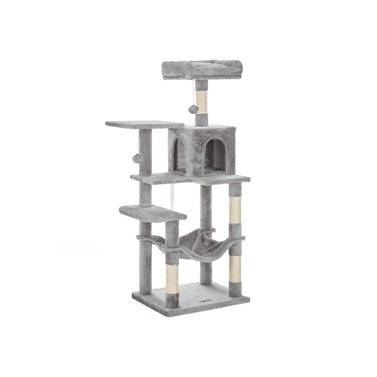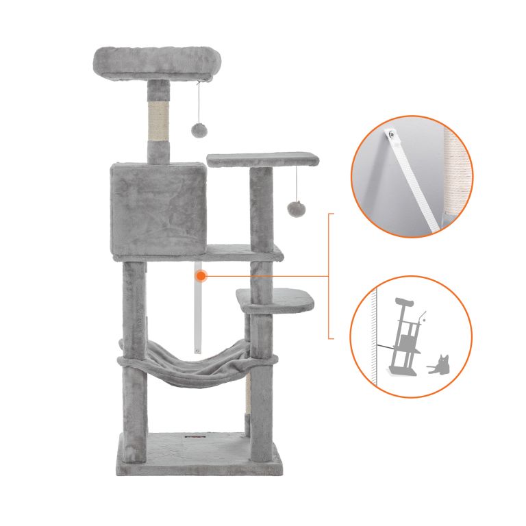 Răsfață-ți pisica cu un turn de vis pentru joacă și relaxare! Designul modern și culoarea gri deschis creează un colț special pentru fiecare felină. Casă încăpătoare, hamac moale și stâlpi de zgâriat – totul pentru confortul și bucuria pisicii tale.