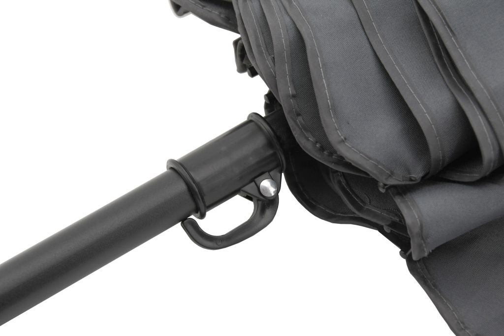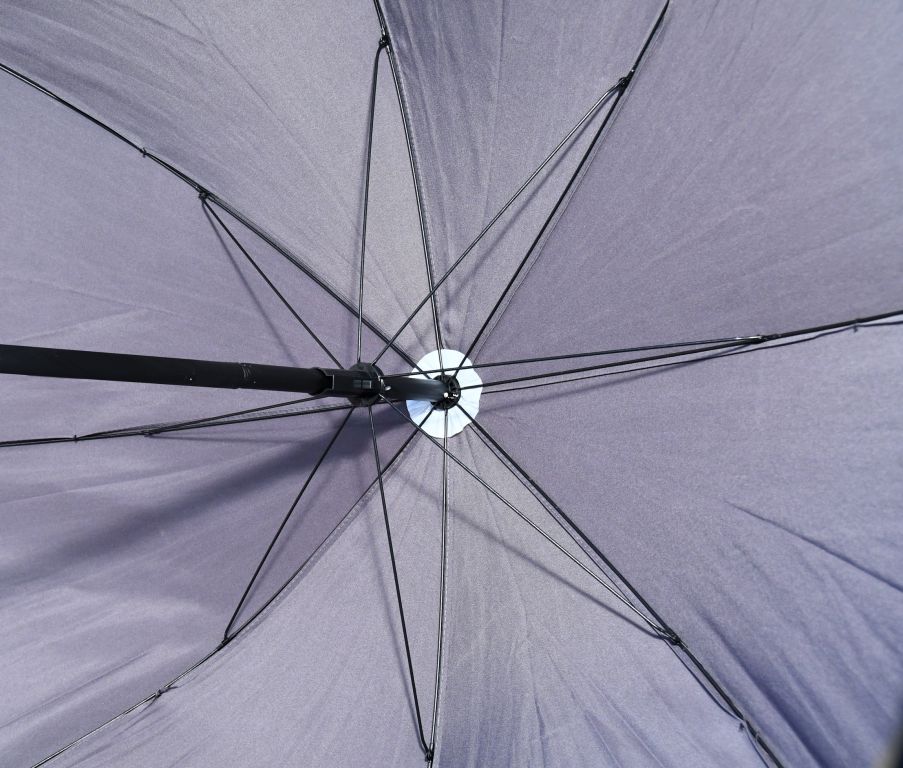 Lungimea "razei" umbrelei este de 180 cm, iar înălțimea totală este de 200 cm. Construcția din două părți este pliabilă și ușor de pliat. Pur și simplu glisați cei doi stâlpi de susținere unul în celălalt și fixați-i cu o pârghie. După aceea, tot ceea ce trebuie să faceți este să desfășurați umbrela în sine. Structura umbrelei are un capăt ascuțit, astfel încât este potrivită pentru a fi înfiptă în pământ.