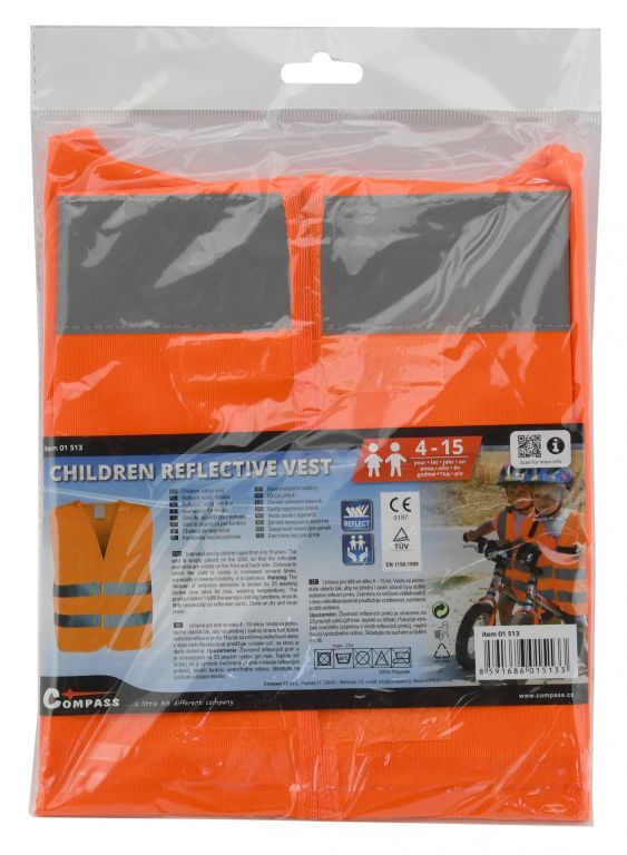 Vestă este realizată din materiale rezistente, se îmbracă rapid peste orice haină și se fixează simplu cu arici pe partea din față. Banda reflectorizantă înconjoară complet vesta, asigurând vizibilitate la 360°. Certificată EN 1150, potrivită pentru copii între 4 și 15 ani.