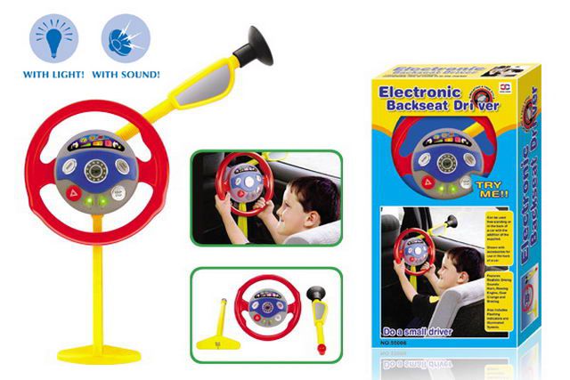Alungați plictiseala pe drum! Niciun mic călător nu mai trebuie să se plictisească pe bancheta din spate a mașinii. El poate conduce mașina la fel ca șoferul. Volanul este format din 3 părți. Datorită ventuzei, volanul se atașează la geamul lateral, măsurând distanța pentru a se potrivi micului șofer. Apoi, partea de jos se prinde de picioare și plecăm.